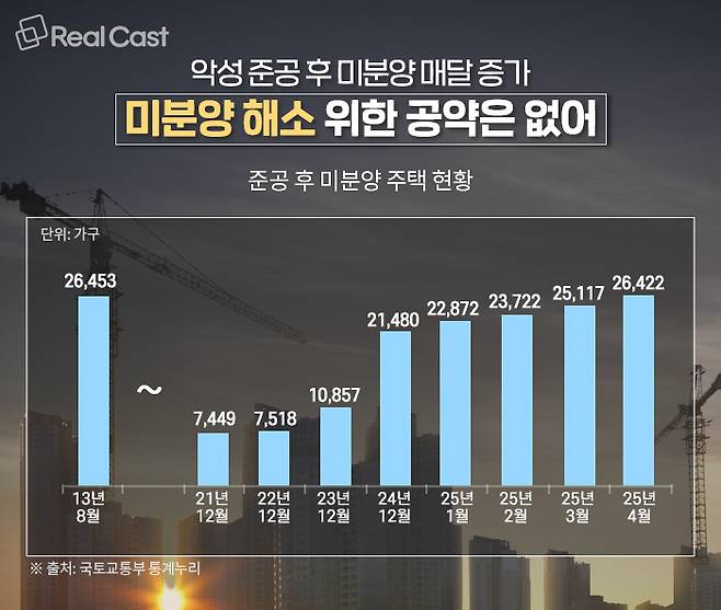 분양시장 상황도 좋지 않습니다. 특히 악성으로 꼽히는 준공 후 미분양은 2013년 8월(2만 6,453가구) 이후 11년 9개월만에 최다인 2만 6,422가구로 집계됐습니다.