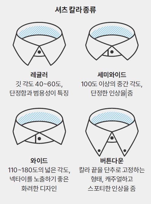 셔츠 칼라는 크게 클래식과 버튼다운으로 나뉜다. 클래식 칼라는 다시 레귤러, 세미와이드, 와이드로 구분한다. 버튼다운은 넥타이를 매지 않을 때 착용하는 캐주얼 셔츠에 가끔 적용한다. 얼굴형이나 체형보다는 나이에 따라 선호하는 칼라가 달라지는 경향이 있다. 2030세대는 와이드 칼라를, 4050세대는 세미와이드 칼라를 선호하는 편이다.
