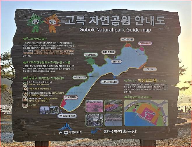 고복저수지를 타원 형태로 길게 둘러싸고 있는 고복자연공원 역시 이곳을 더욱 특별하게 만드는 공간 입니다. 세종시를 대표하는 자연친화적 시립공원으로 알려진 고복자연공원은 물과 숲, 그리고 주변 마을이 조화를 이루며 아름다운 수변 경관을 만들어 내고 있습니다. 또한 하늘다람쥐와 황조롱이, 붉은 배새매 등 다양한 야생 동·식물이 서식하는 생태 공간이기도 합니다. 그래서 단순한 산책 공간을 넘어 자연과 생태를 함께 경험할 수 있는 공원으로 평가받고 있습니다.