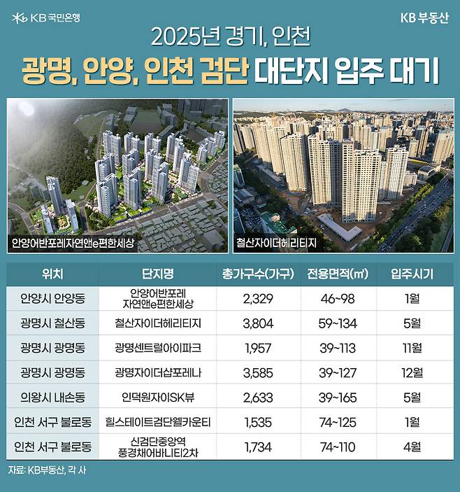 광명시에서는 5월 철산동 철산자이더헤리티지(3,804가구), 11월 광명동 광명센트럴아이파크(1,957가구), 12월 광명동 광명자이더샵포레나(3,585가구) 등이 입주합니다. 철산자이더헤리티지는 서울지하철 7호선 철산역을 이용할 수 있고, 가산디지털단지, 서부간선도로, 안양천 접근성이 좋습니다. 84㎡가 12억3,000만~14억5,000만원입니다.