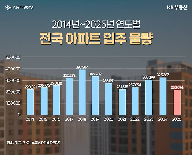 이제 2024년 달력이 한 장 밖에 남지 않았습니다. 다가오는 2025년에는 전국에 23만여 가구가 입주할 예정입니다. 이는 2014년 이후 가장 적은 수치입니다. 이에 시세보다 저렴한 전셋집을 찾기가 쉽지 않을 전망이라고 하는데요. KB부동산이 전국에 입주장이 펼쳐질 대단지 위주로 정리해 봤습니다.