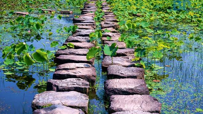 수면 위에 떠 있는 연꽃과 수련, 그 사이를 잇는 징검다리와 돌다리, 중간중간 설치된 정자와 탐방 데크는 이곳이 단순한 연못이 아니라 하나의 정원이라는 사실을 증명한다.