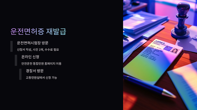 가까운 경찰서 교통민원실을 방문하여 운전면허증 재발급 신청서를 작성하고 접수할 수 있습니다. 신분증과 사진 1매를 지참해야 하며, 직접 수령 또는 등기 수령을 선택할 수 있습니다.