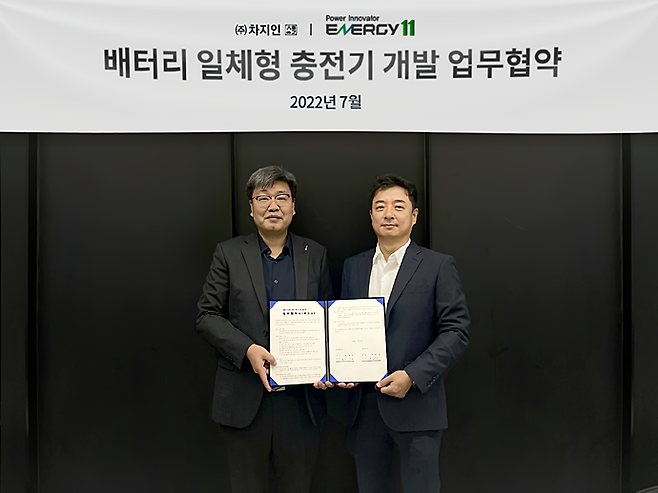 전기차 충전 플랫폼 사업자인 차지인과 국내 1호 나트륨 이차전지 개발 업체인 에너지 11은 지난 22일 일체형 전기자동차 충전기 개발을 위해 업무협약(MOU)'을 체결했다고 25일 밝혔다.