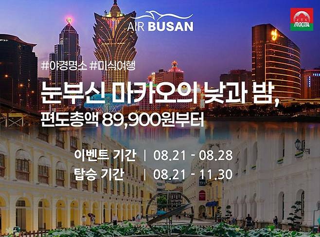 이번 프로모션은 8월21일 오전 11시부터 28일까지 에어부산 홈페이지를 통해서 시행한다. 부산-마카오 최저 편도 총액은 8만9,900원부터이며 탑승 기간은 11월30일까지다.