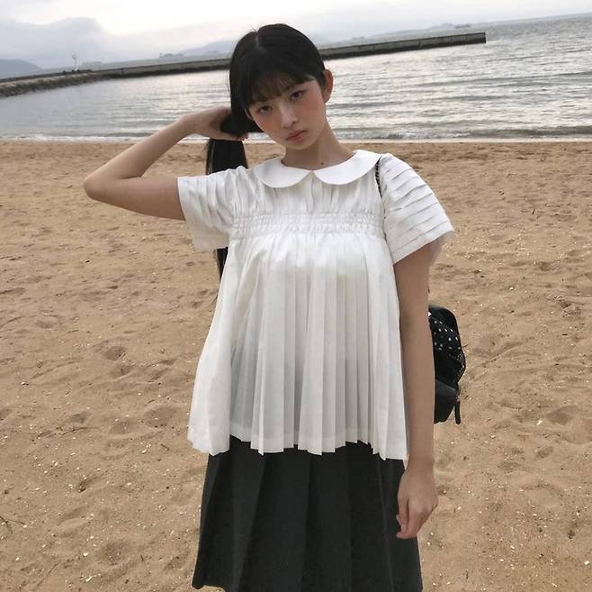 둥근 카라와 주름 디테일로 완성된 이 아이템은 단순한 블라우스를 넘어, 하나의 스타일 코드로 자리 잡은 듯한 인상을 준다.
