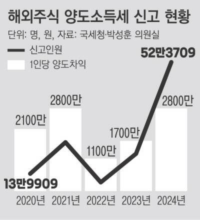박성훈 국민의힘 의원이 22일 공개한 국세청의 ‘최근 5년간 해외주식 양도소득세 신고 현황’ 자료를 보면, 2024년 귀속 해외주식 양도소득세 신고인원은 52만3709명으로 집계됐다. 1년 전(20만7231명)의 2.5배 이상으로 사상 처음 50만명을 넘었다.