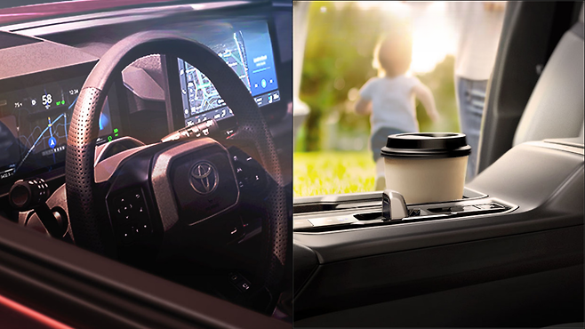 센터 콘솔 디자인이 크게 현대화되었다. 토요타는 기존의 전통적인 기어 시프터에서 벗어나 전기면도기와 유사한 더 작고 간소화된 디자인을 채택했다. 컵홀더와 수납공간이 평행하게 배치되어 현행 모델보다 깔끔한 느낌을 준다. 팔걸이 앞쪽의 브러시드 알루미늄 마감은 고급스러운 디테일로 눈에 띈다.