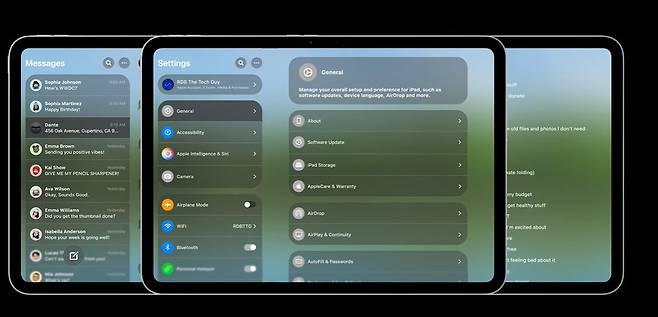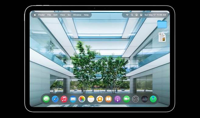 솔라리움 네이밍에 걸맞게 반투명하고 유리 같은 디자인이 iPad OS 26에 스며들어 앱 아이콘, 메뉴, 알림, 창의 모습이 이전보다 부드럽고 세련된 느낌으로 바뀐다.