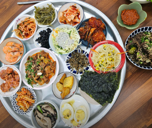 ▶ 김치, 나물, 조림, 전, 볶음 등 전통 한식 반찬 구성