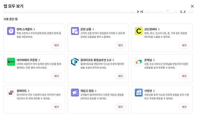 또 외부 연동도 다양하게 붙이고 있습니다. 저희 자회사로 ‘온채널’이라는 상품 도매 서비스가 있어요. 여기서 바로 도매 상품 떼어다 파는 기능도 있고요. ‘코드앤버터’라고 고객 맞춤형 배너, 팝업 서비스도 연동 중입니다.