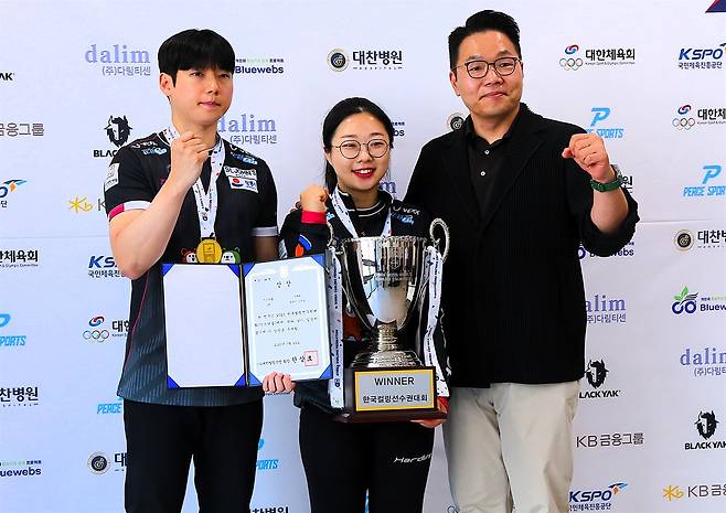 | ▲ 2025 한국컬링선수권 믹스더블 결승에서 우승하며 '올림픽 국가대표'의 마지막 자리에 오른 선수들. 왼쪽부터 정영석·김선영 선수, 한상호 대한컬링연맹 회장 |