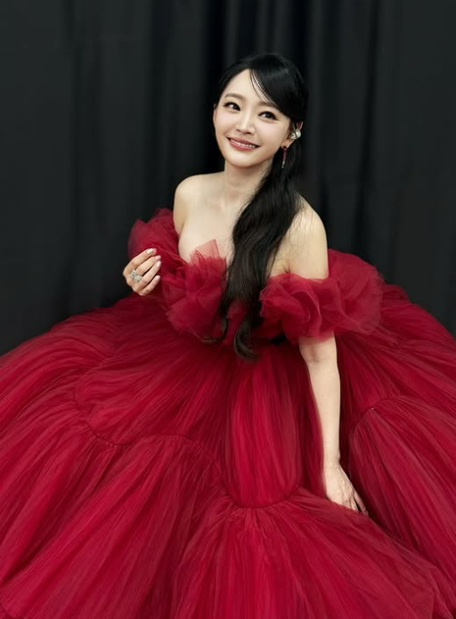오프숄더 디자인은 어깨를 드러내어 여리여리한 느낌을 주었고, 드레스의 풍성한 실루엣이 전체적인 룩을 우아하고 세련되게 만들어줬죠.