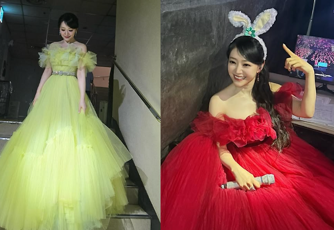 김소현 님의 이번 드레스 룩은 발랄하고 화사한 매력을 발산하는 스타일이었어요. 화려하고 풍성한 디자인이 그녀의 아름다움을 한층 돋보이게 하며, 마치 <미녀와 야수>의 벨을 연상시키는 비주얼을 완성했죠.