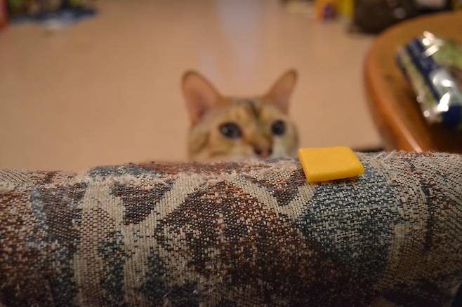 슬라이스 치즈 비닐을 벗기면 고양이가 달라는 듯 앞발로 톡톡 건드릴 때가 있어요. 귀여운 눈으로 고양이가 치즈를 달라고 할 때면 고민이 듭니다. 하지만 사람용 치즈가 짜고 지방이 많아, 고양이 치즈를 따로 사는 게 좋답니다.
