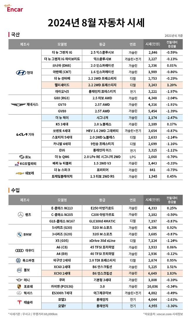 8월 국산차와 수입차 대표 모델의 전체 평균 시세는 지난 달 대비 0.61% 하락한 약보합세다. 특히 근래 전기차 시장 수요 둔화(캐즘)으로 주요 전기차 시세가 3개월 연속으로 하락한 경향을 보여 눈길을 끈다고 엔카닷컴이 6일 밝혔다.