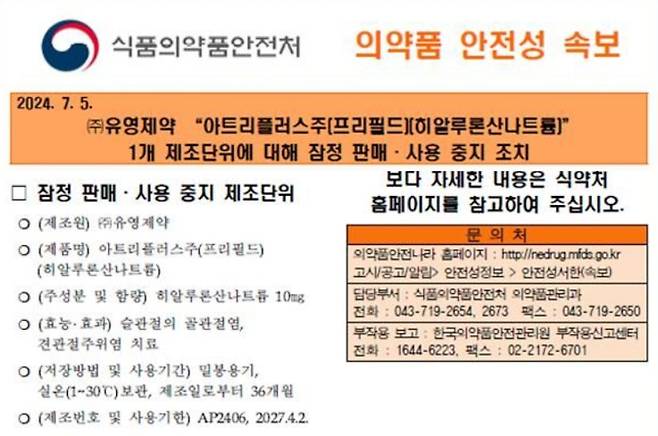 유영제약의 유명 골관절염 치료제인 '아트리플러스주'(성분명 히알루론산나트륨)가 잠정 판매 중지, 사용 중지 조치를 받았다.