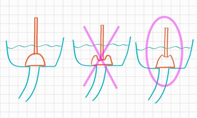 뚫/어뻥을 변기구멍에 대고 한 5cm 정도만 들어가도록 설렁설렁 힘주고 대신 빠르게 20번 정도 펌핑 (O)