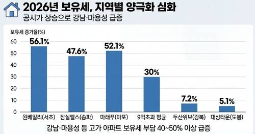강남 3구(강남구·서초구·송파구)와 마용성(마포구·용산구·성동구) 일대 주요 고가 아파트의 보유세(재산세+종합부동산세)는 40~50% 넘게 급증할 것으로 보이지만 강북구와 도봉구, 노원구 등 외곽 지역의 세금 인상 폭은 소폭에 그칠 전망이다.