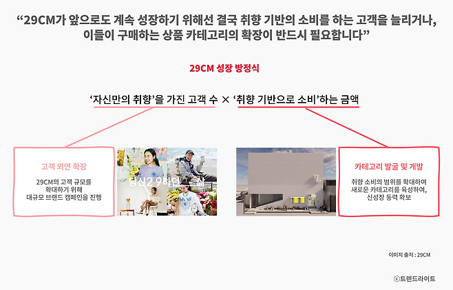 그렇다면 이러한 상황에서 29CM가 앞으로 지속적인 성장을 하려면, 어떻게 해야 할까요? 크게는 2가지 방향성이 있을 겁니다. 하나는 '자신만의 취향'을 가진 고객의 수 자체를 늘려나가는 겁니다. 이를 위해서 작년에 진행했던 것이, '당신2 9하던 삶' 브랜드 캠페인이었습니다. 이후로도 대대적인 브랜딩 활동을 연이어 진행하고, 온오프라인으로 고객 접점을 점차 확대 중에 있는데요. 29CM는 이를 통해 취향 기반 소비를 즐기는 고객 외연 확장에 어느 정도 성공을 거둡니다.