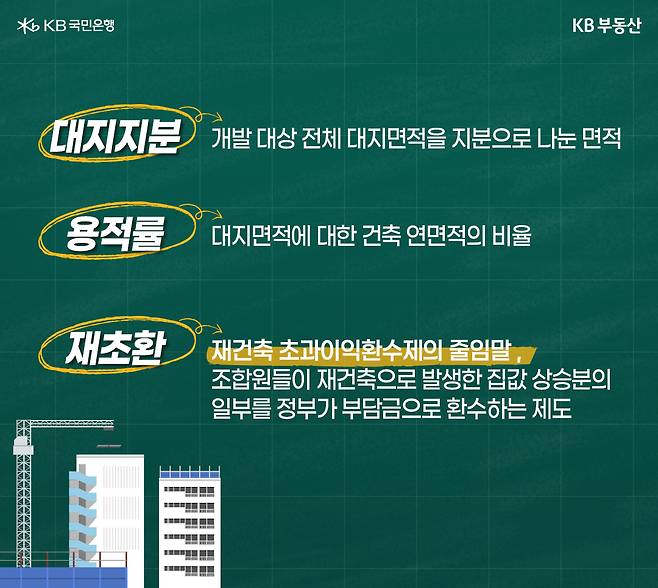 이렇게 정비사업이 활발하게 진행이 되면서 재건축이나 재개발 단지에 투자해볼까 생각하는 수요자들이 늘고 있지만 어려운 용어 때문에 투자에 망설이는 분들이 많습니다. 내가 알지 못하는 상황에서 타인의 말만 듣고 투자를 감행했다간 금전적으로 큰 손해를 입을 수도 있어 더 조심할 수밖에 없는데요. 이에 KB부동산이 정비사업 투자를 고려하는 분들을 위해 꼭 알아야 하는 용어를 알기 쉽게 정리해봤습니다.