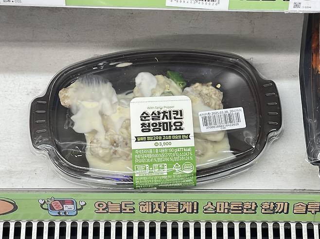 청양고추의 알싸한 맛과 마요소스가 고소해서 부드러운 닭과 잘 어울려요.
