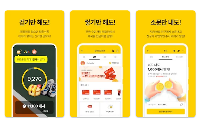 캐시워크는 걸으면 걸을수록 포인트가 쌓이는 만보기형 어플이다. 걷기만 해도 캐시가 쌓여 출시 1년 만에 500만 다운로드를 돌파한 국민 앱이기도 하다. 하루 걸음 수를 기준으로 보물상자 속 캐시도 확인할 수 있다. 이렇게 걷기만 해서 모은 캐시들은 현금처럼 사용이 가능하며 다양한 제휴 상품권 구매도 가능하다. 그 외에도 걸음 수 챌린지, 스탬프 챌린지, 인증샷 챌린지 등 남녀노소 누구나 참여 가능한 챌린지를 늘려가고 있다.