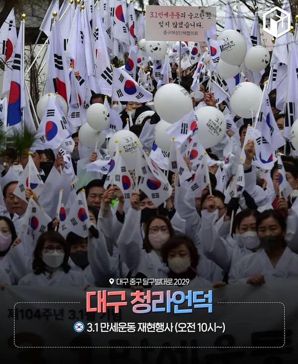 현재 계단 한 쪽으로는 태극기가, 다른 한 쪽으로는 삼일만세운동 당시 모습이 담긴 사진들이 전시되어 있습니다. 대구 청라언덕에서는 2025 삼일절 기념행사로 오전 10시 3·1 독립만세운동 재현행사가 개최됩니다. 태극기를 들고 대한독립 만세를 외치던 조상들의 모습이 생생하게 재현될 예정입니다.