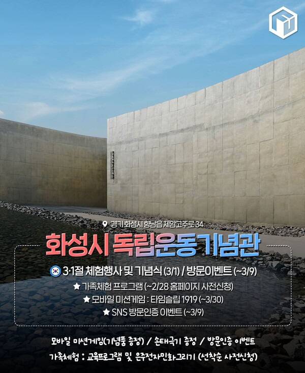 화성 독립운동기념관에서는 3월 9일까지 방문 인증 이벤트를 진행하고 있습니다. 안내데스크에서 손태극기를 수령한 뒤 SNS에 방문 인증을 남기면 추첨을 통해 경품을 받을 수 있죠. 2025 삼일절 행사로는 오전 10시부터 11시, 기념관 강당에서 기념식이 개최됩니다.