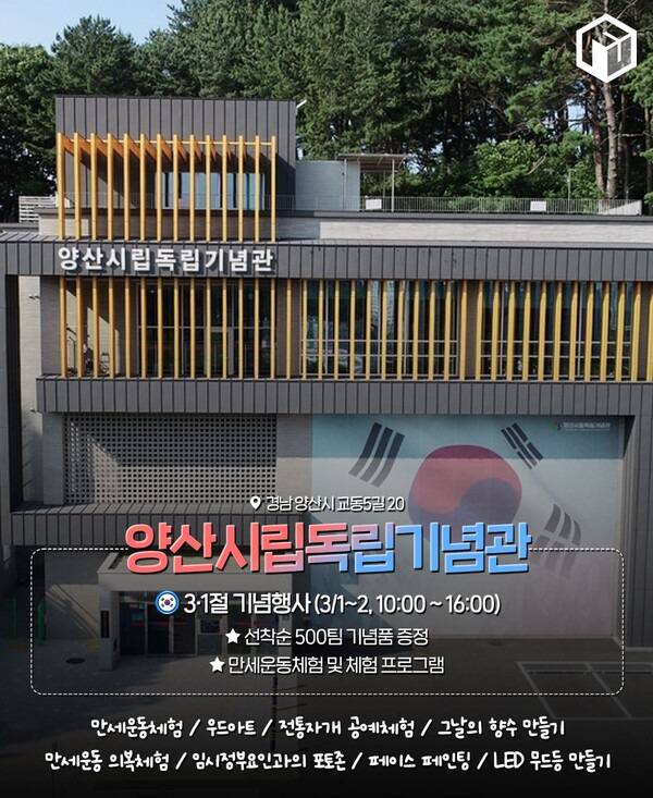 충절의 고장으로 불리우며 수많은 독립운동가가 탄생한 양산의 시립독립기념관도 삼일절 가볼만한 곳으로 추천하는 여행지입니다. 제106주년 삼일절을 기념하는 행사가 2025년 3월 1일부터 2일, 주말 양일간 오전 10시에서 오후 4시까지 열릴 예정인데요.
