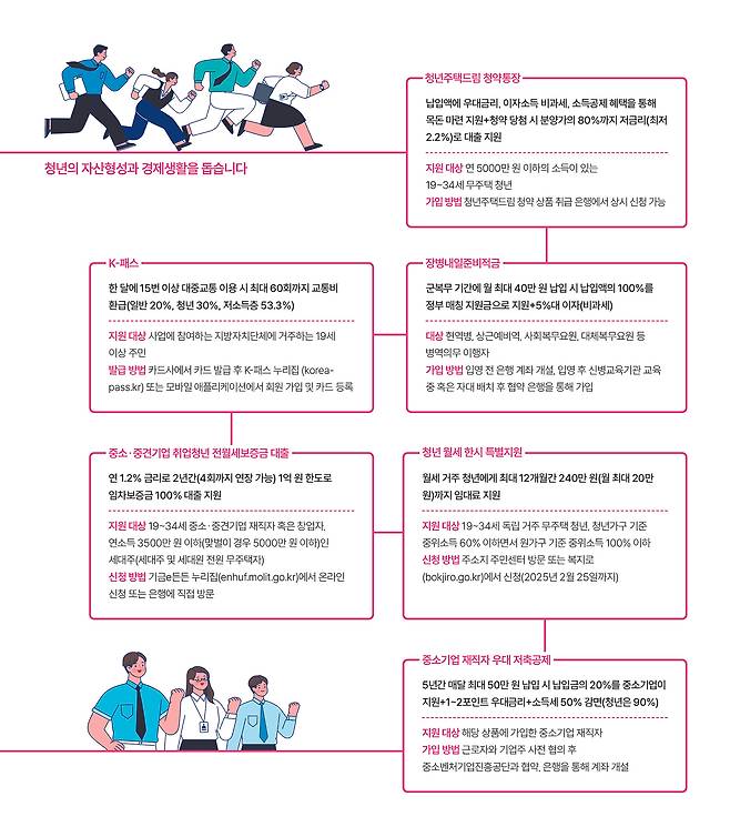 청년도약계좌, 청년주택드림 청약통장, K-패스, 청년 월세 한시 특별지원 등 청년의 자산형성과 경제생활을 돕는 다양한 정책이 있습니다. 자세한 내용은 정책주간지 'K-공감'에서 확인하세요.