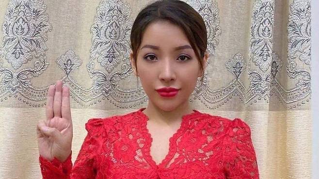 전직 의사 겸 모델 낭 므웨 산이 주인공. 군부는 2주 전에 그녀가 “문화와 존엄성을 해쳤다”며 기소했는데 신속하게 선고 공판까지 마무리됐다고 영국 BBC가 28일(현지시간) 전했다. 사진에서 보는 것처럼 지난해 군부가 쿠데타로 권력을 장악하자 산은 세 손가락을 모아 드는 저항의 상징을 카메라에 담고 군부 반대 시위에 참여했다.