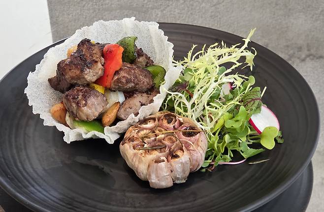 ‘큐브스테이크’는 추천 메뉴다. 스테이크와 남해 통마늘이 구워져 나오는데 큼직한 통마늘이 스테이크 못지않은 존재감을 자랑한다. 담백한 스테이크와 남해 마늘의 단맛이 어우러져 감탄을 자아낸다. ‘이소베마끼’는 밥 없이 참치, 연어, 무순, 파래, 생강채가 들어간 롤이다. 유자 소스를 곁들여 비린내 없이 다채로운 바다 맛을 즐길 수 있다. ‘새우 프리투라와 크리시피 토마토’는 설탕을 살짝 뿌려 토치로 구운 토마토와 새우를 붙여 튀긴 라이스페이퍼가 맥주와 잘 어울리는 안주로 손색이 없다. 게미에서는 꼭 외부 테라스로 나가 남해의 석양을 감상하며 ‘남해 유자 모히또’ 한잔을 마셔보자. 잊을 수 없는 여름의 장면을 선사할 것이다.