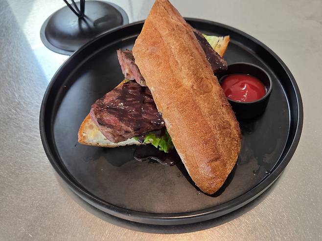 수영장 옆 ‘풀사이드 스낵&바’에서도 남해 특화 메뉴를 맛볼 수 있다. 대표 메뉴인 ‘스테이크 샌드위치’는 유자 발효종으로 만든 바게트에 두툼한 스테이크를 끼운 투박하고 묵직한 샌드위치다. 기공이 많고 은은한 맛이 나는 유자 바게트가 달달한 스테이크 소스, 채소와 조화를 이룬다. 남해 인근에서는 오징어와 한치가 많이 잡힌다. 검은 비주얼이 인상적인 ‘블랙 잉크 커틀피쉬 앤 칩스’는 남해 여름 오징어에 인근 독일마을에서 받아 온 맥주로 튀김 반죽을 만들어 식감이 부드럽고 바삭하다. 새콤한 소스와 함께 고소하고 신선한 남해산 오징어 튀김을 맛볼 수 있다.