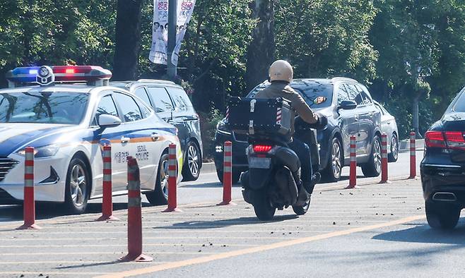 | 안전지대 뚫고 경찰도 ‘조롱’ 지난 8일 서울 용산구에서 경찰차가 옆에 있는데도 오토바이 한 대가 안전지대를 버젓이 달리고 있다. 노란색 빗금이 있는 안전지대는 차량(오토바이)이 진입해서는 안 된다. 최상수 기자 |