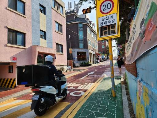 | 아이들 통학길 기준속도 ‘훌쩍’ 지난 12일 서울 강남구 학동초등학교 스쿨존에서 오토바이 한 대가 시속 20㎞인 제한속도를 20%나 초과한 시속 24㎞로 달리고 있다. 김나현 기자 |