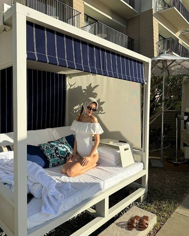 아이린은 어깨를 드러낸 순백의 오프숄더 수영복과 가운을 걸쳐 우아하면서도 사랑스러운 매력을 뽐냈습니다.