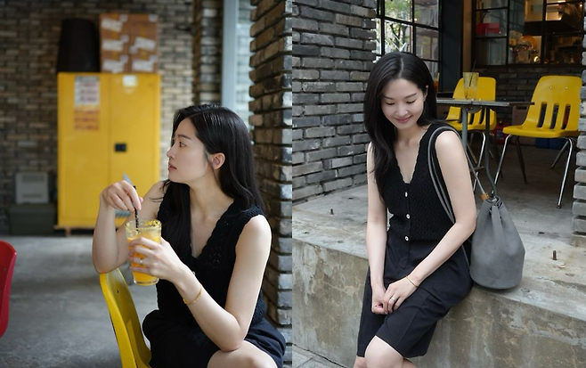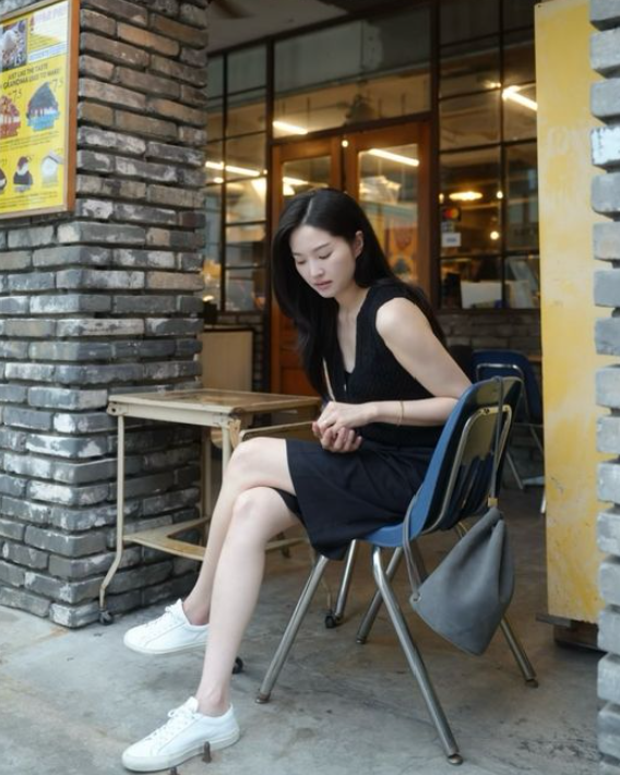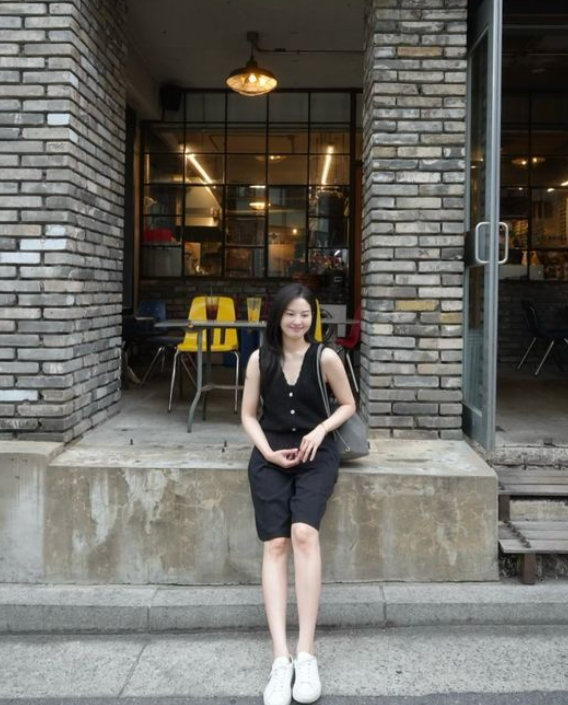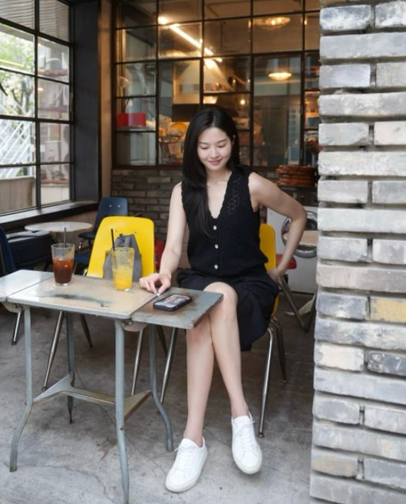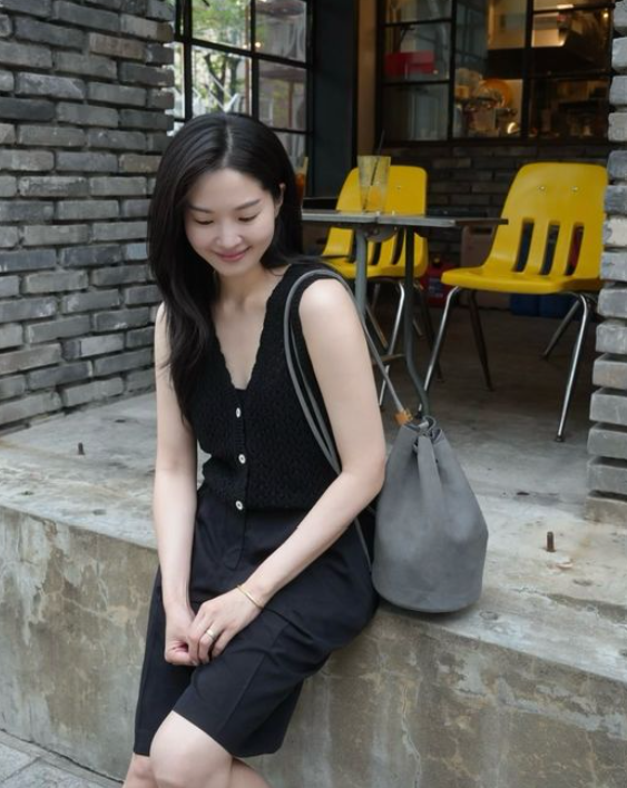 사진 속 류이서는 올블랙 민소매 니트 베스트와 버뮤다 팬츠, 깔끔한 화이트 스니커즈를 매치해 시크하면서도 단정한 여름룩을 완성했다.