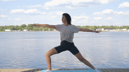 매트에 서서 오른발을 뻗어 내딛습니다. 오른쪽 무릎은 90도로 구부리고, 왼쪽 다리는 완전히 펴줍니다. 양팔을 옆으로 곧게 펴 손끝이 같은 높이가 되도록 합니다. 자세를 유지하며 버틴 뒤, 반대쪽 방향으로 반복합니다.