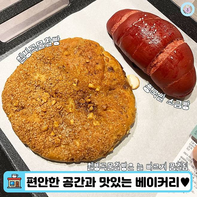 첫 방문 때 자리가 쾌적하고 메뉴가 맛있어서 두 번째는 일하러 방문했어요. 역시나 제일 맛있었던 웰빙곡물찰빵을 주문했고, 먹깨비가 좋아하는 흥국쌀 소금빵(4,500원)도 먹어봤어요. 소금빵은 특별한 맛은 아니었지만 어쩐지 순삭하게 되더라구요. 웰빙곡물찰빵은 포장해 오려고 보면 늘 품절이었어요. 그래서 눈에 보이면 무족권 담아야 해요!