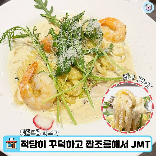 같은 날 먹었던 <명랑크림 파스타> 역시 너무 맛있었어요! 제일 좋아하는 파스타 종류여서 평소에도 자주 사먹는 편인데 먹어본 것 중에서 최고였다고 할 정도로 JMT이더라구요. 적당히 꾸덕하고 명란의 짭조름한 맛이 강해서 한 그릇을 다 비우는 동안 물리지 않았어요.
