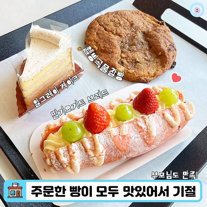 첫 날엔 부모님이 고르신 얼그레이 케이크(8,000원), 웰빙곡물찰빵(5,500원)과 먹깨비가 고른 딸기요거트 브레드(7,000원)를 맛봤어요. 가격이 저렴한 편은 아니었지만 베이커리 사이즈가 큰 편이어서 조금은 위안이 되더라구요.