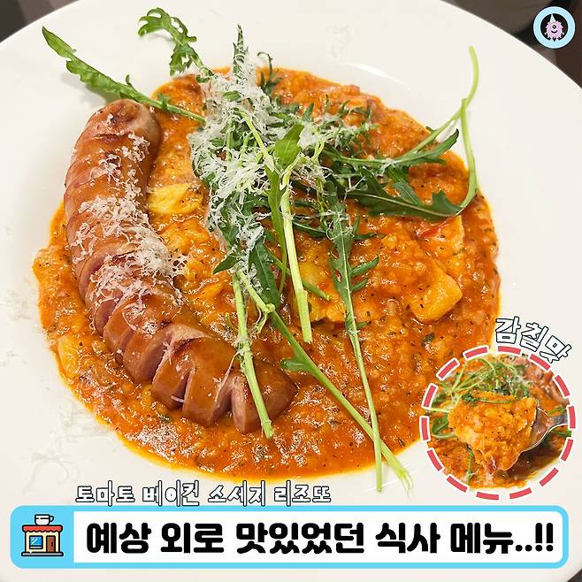 세 번째 방문했을 때엔 식사하고 커피까지 마실 생각으로 다녀왔어요! 그리하여 주문하게 된 식사 메뉴 중 <토마토 베이컨 소세지 리조또>부터 보여드릴께요!