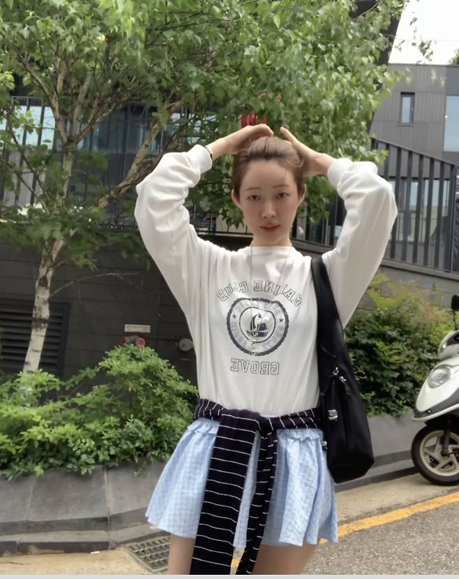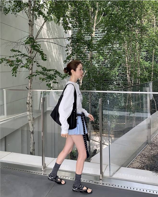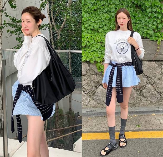 차정원은 프린트 맨투맨에 하늘색 체크 셔츠를 레이어드한 듯 연출한 미니스커트에 스트라이프 카디건을 허리에 묶어 캐주얼하면서도 감각적인 실루엣을 완성했습니다.