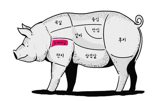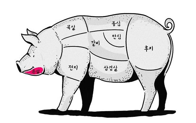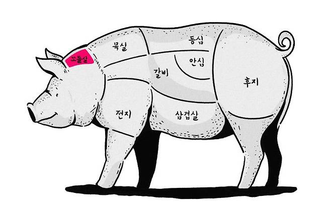 돼지의 머리와 목살 사이에 위치한 꼬들살. 꼬들목살이라고도 불리며, 돼지 한 마리에서 400g 정도만 얻을 수 있다. 이름에 걸맞게 꼬들꼬들한 식감에 특유의 육향을 가졌다. 타 부위에 비해 단백질 함량이 높아 다이어트에도 좋다.
