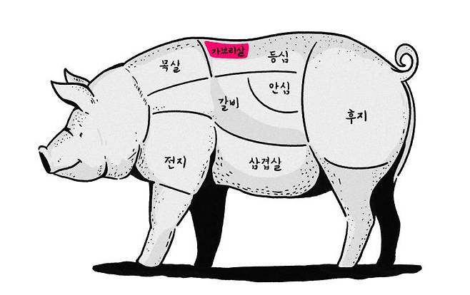 돼지의 등심 앞쪽과 삼겹살 사이에 위치한다. 그 덕에 가브리살은 기름층이 있어 고소한 맛을 내는 부위다. 꼬들살과 마찬가지로 돼지 한 마리에서 얻을 수 있는 양은 400g 정도뿐. 얼핏 보면 항정살과 같은 부위로 착각할 수 있다.