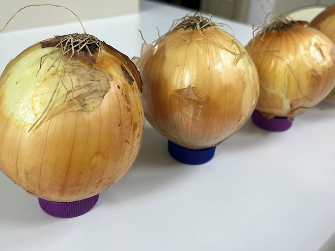 병뚜껑을 뒤집어 놓은 후 양파를 올려 보세요. 아래 뿌리 부분만 병뚜껑에 닿으니 나머지 부분은 외부 마찰이나 압력 없이 보존할 수 있습니다.