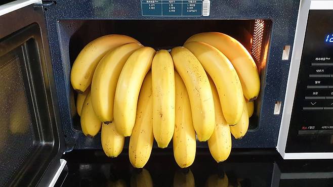 가장 간단한 방법은 전자레인지를 활용하는 것이다. 껍질을 벗긴 바나나를 접시에 올린 뒤 30초에서 1분 정도만 가열하면 된다.
