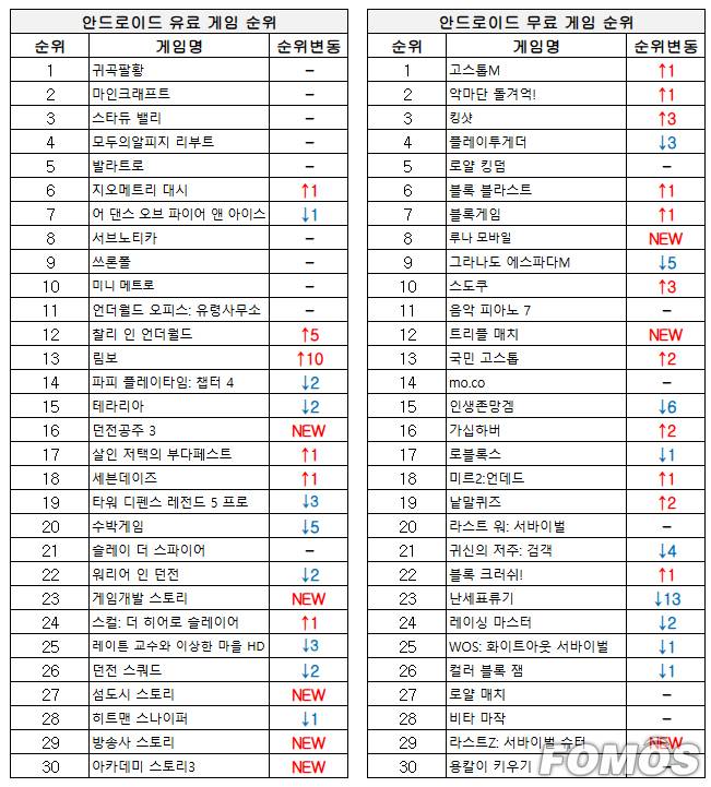 블록을 소재로 한 퍼즐 게임 '블록 블라스트와 '블록게임'은 1계단씩 상승하며 각각 6위와 7위에 올랐다.
