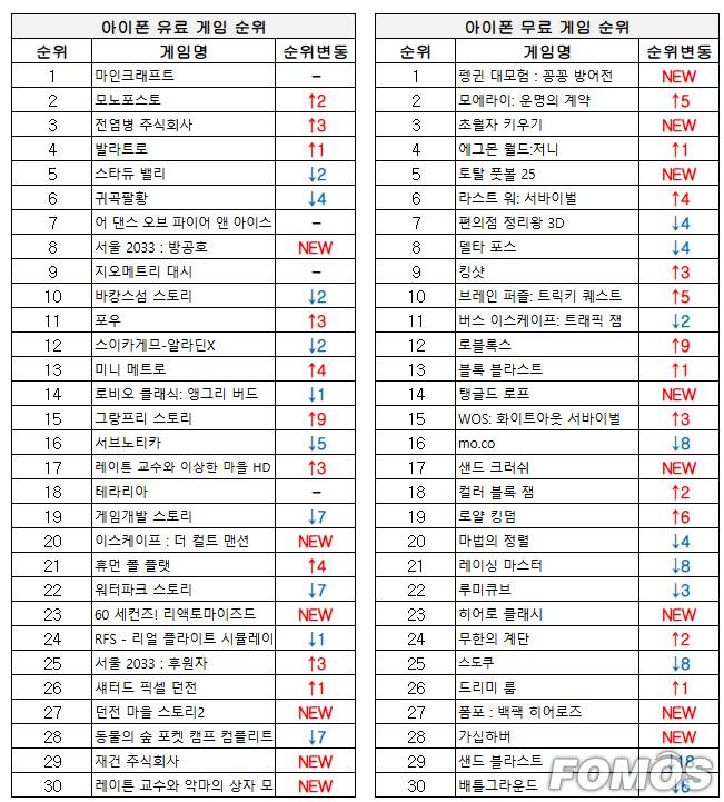 유료 게임 순위에서는 포뮬러 레이싱을 사실감 있게 구현한 레이싱 게임 '모노포스토'가 2위에 올랐다. 이 게임은 모바일 플랫폼에서도 사실적인 레이싱을 구현하며 높은 완성도를 지녔다.